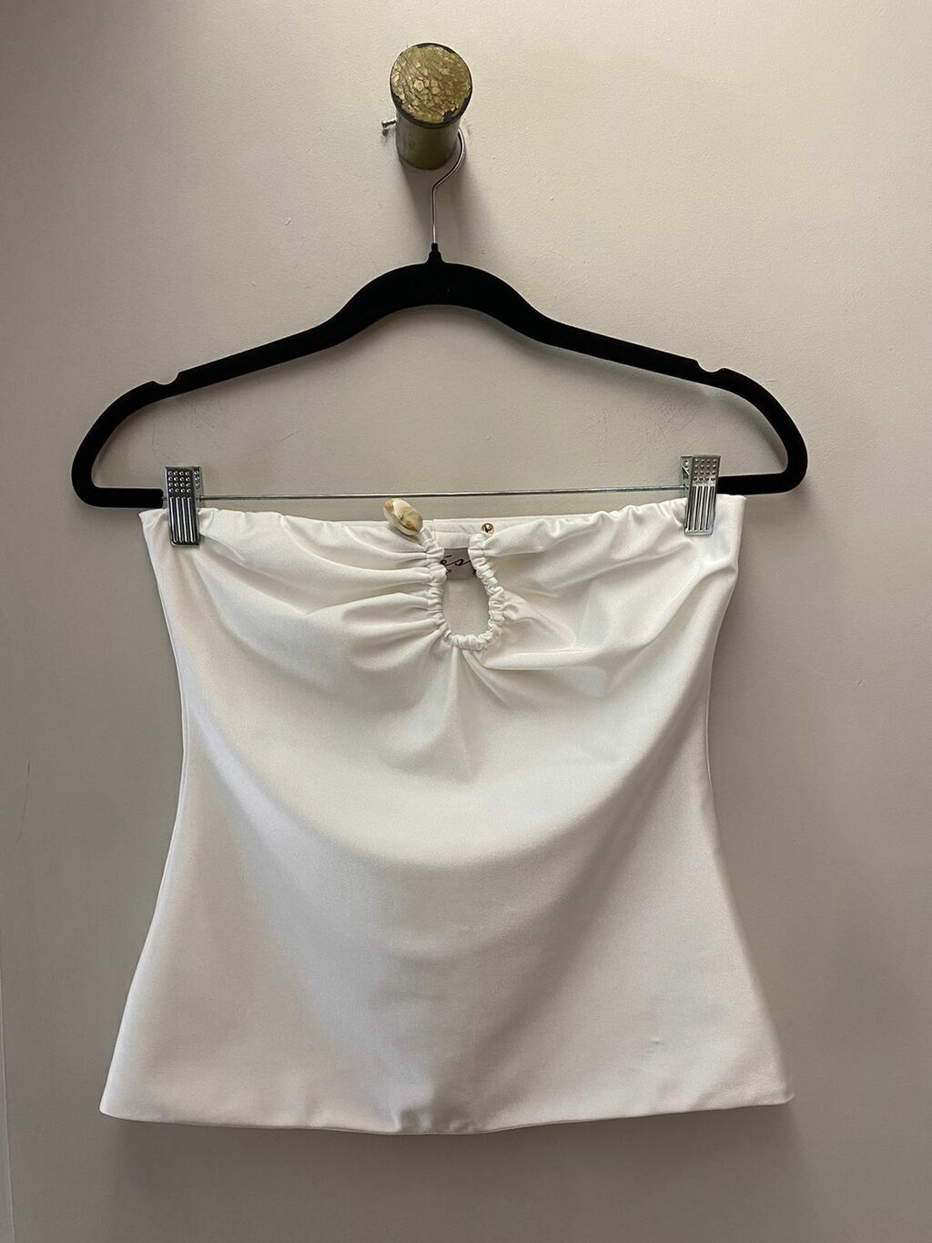 Blusa Meg: Elegância e conforto em uma peça única. Confeccionada em malha fria branca , a blusa tomara que caia destaca-se pelo detalhe no decote e seu leve frazido.