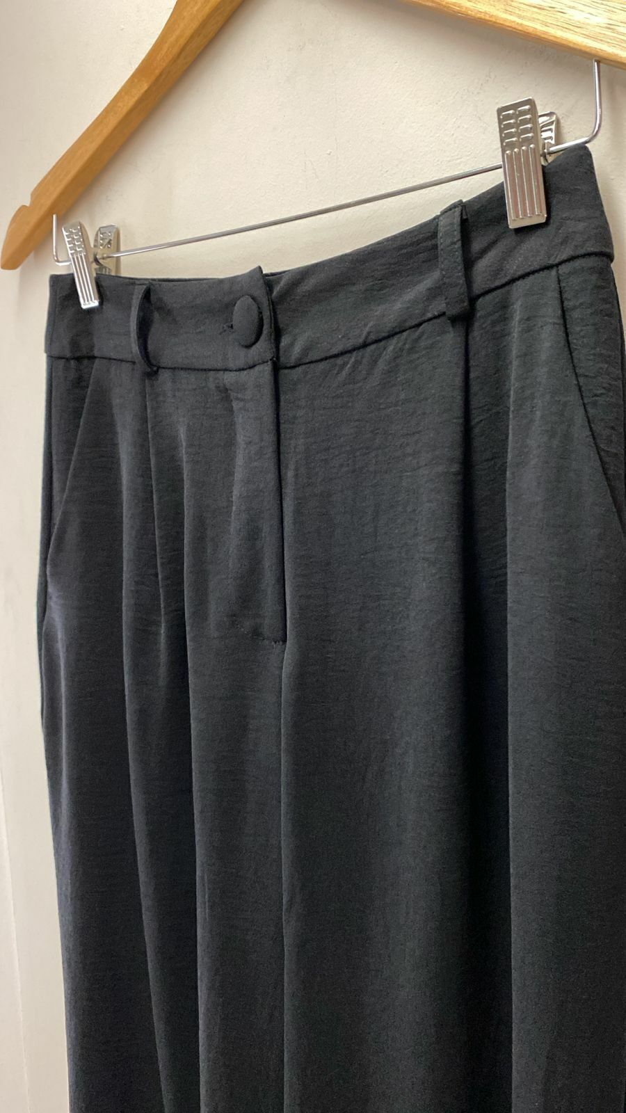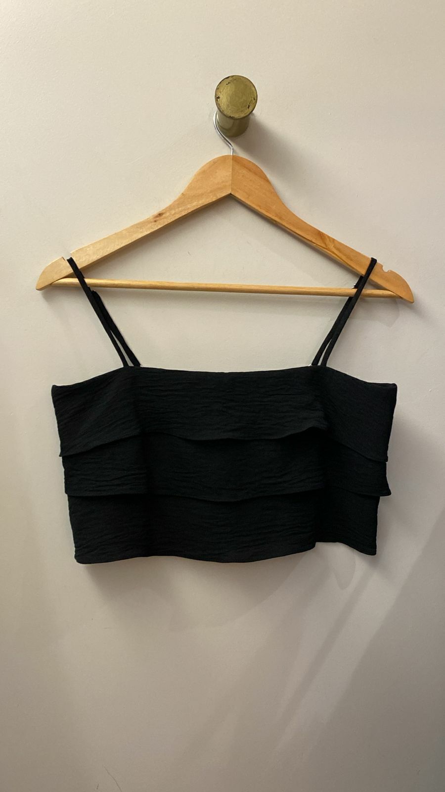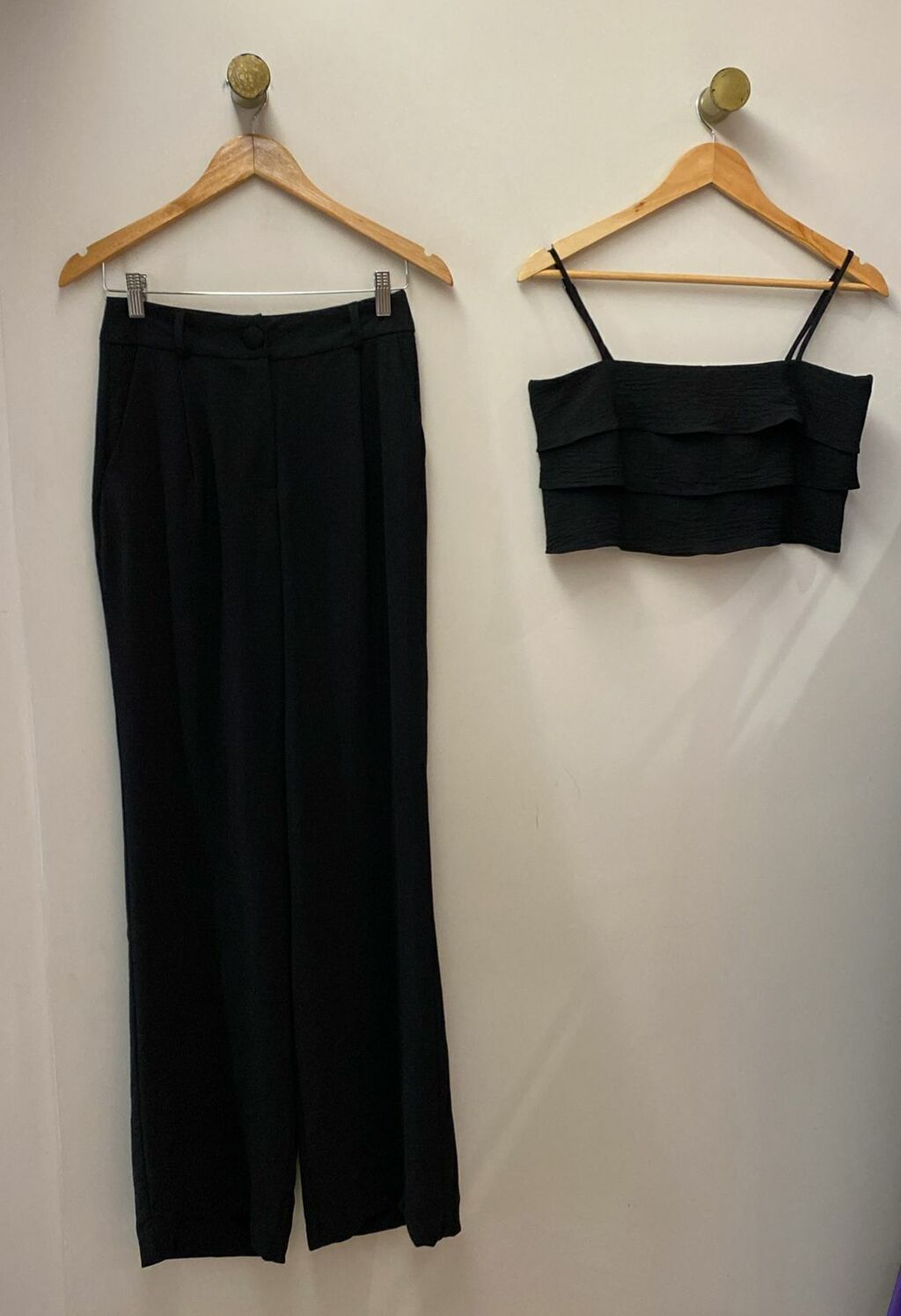Conjunto em crepe air flow preto com blusa com camadas, alça com regulagem.