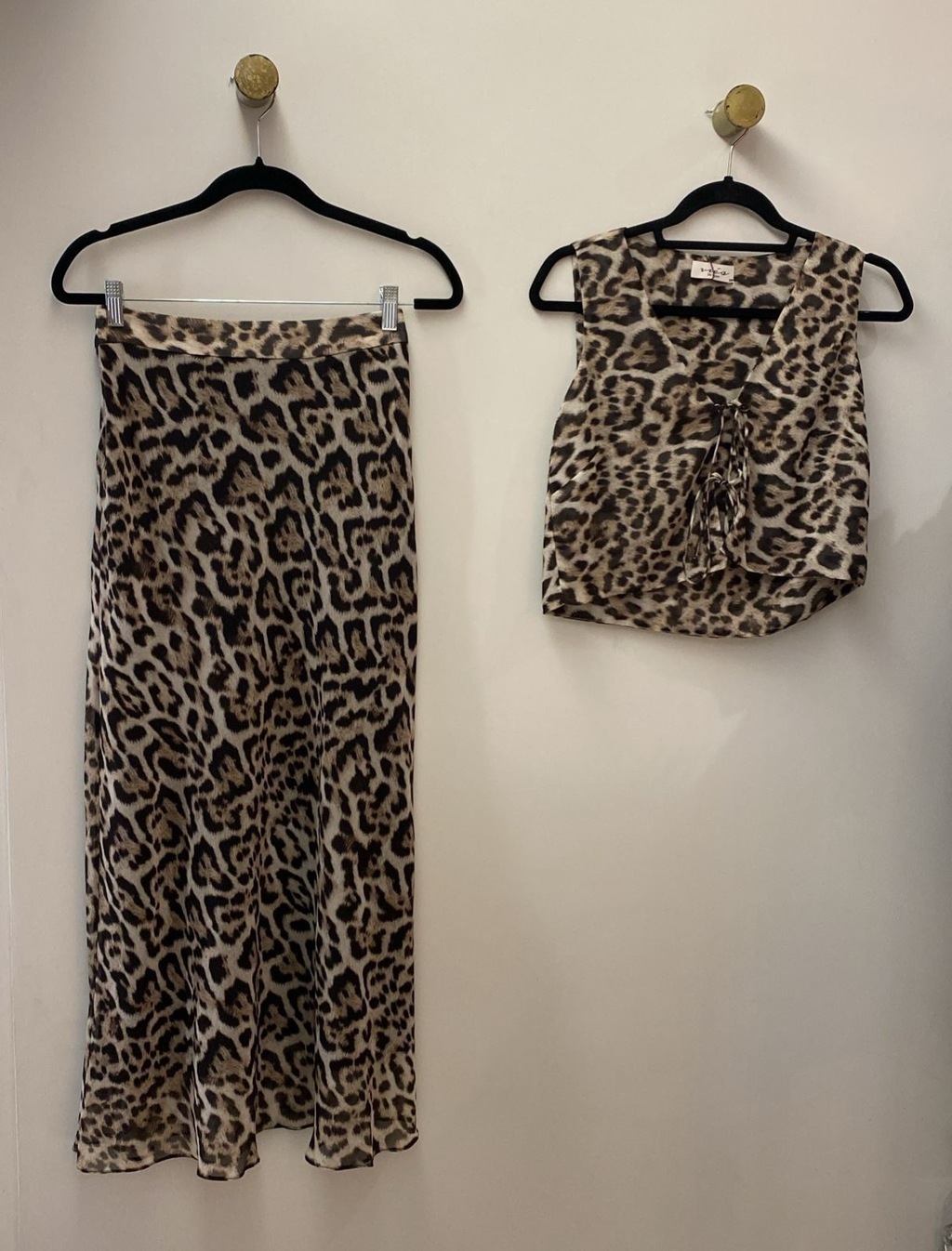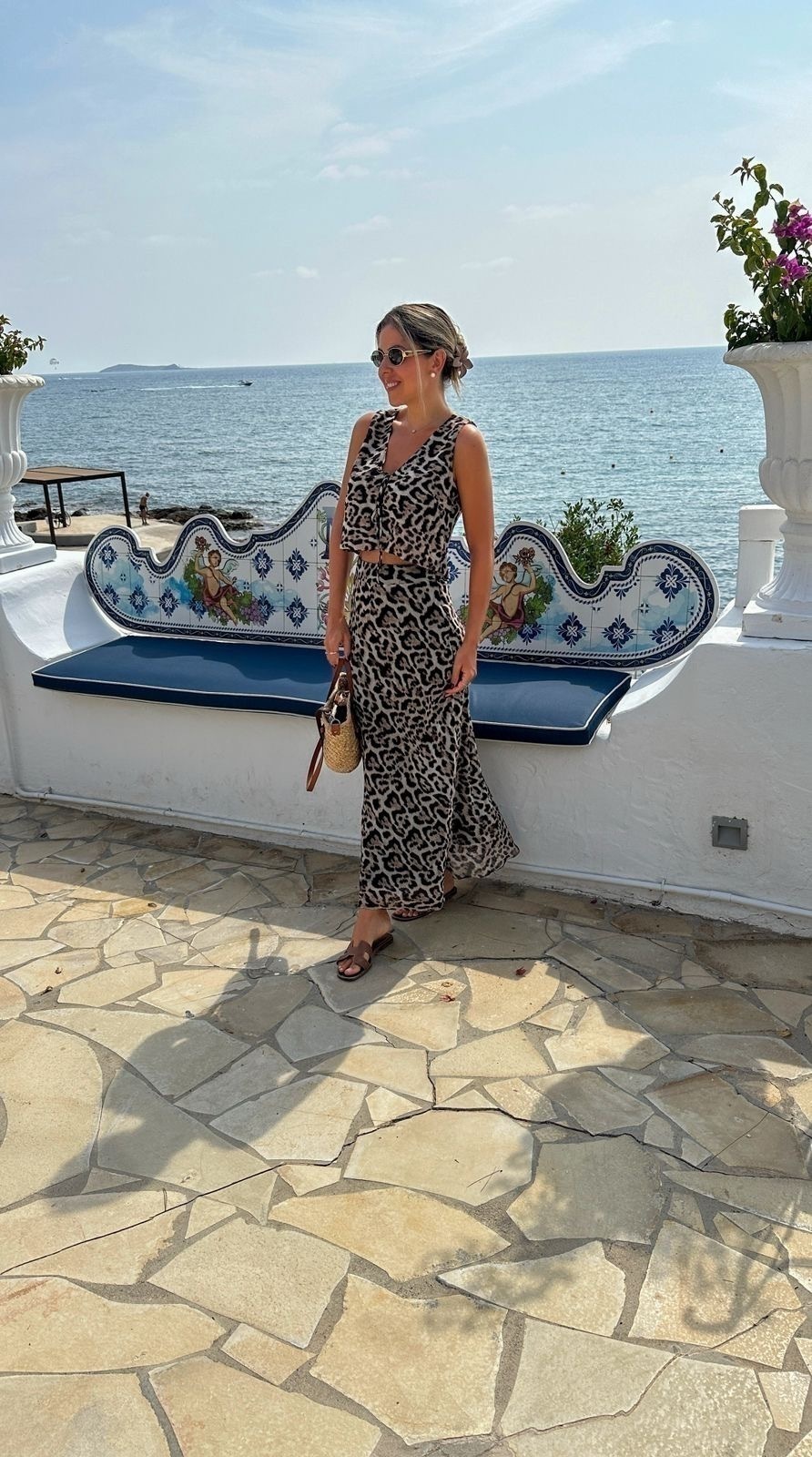 Conjunto em musseline estampa animal print com blusa com amarrações.