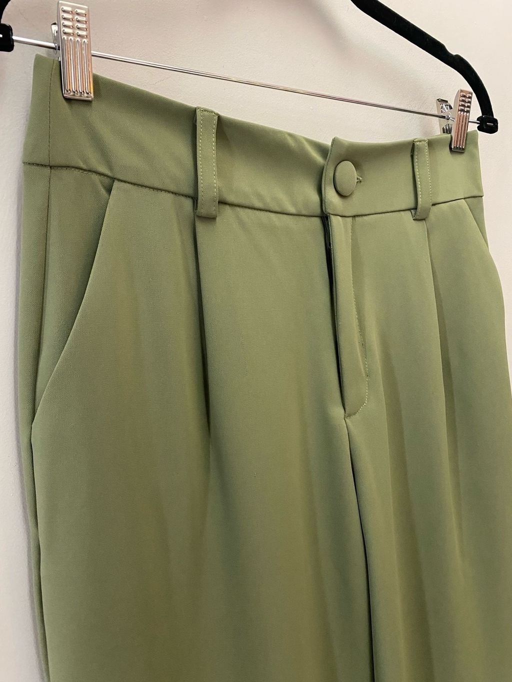 Conjunto Karol: um toque de sofisticação em alfaiataria verde. A blusa tomara que caia em tomaz destaca-se pelo detalhamento elegante, enquanto a calça pantalona completa o visual refinado com perfeição.