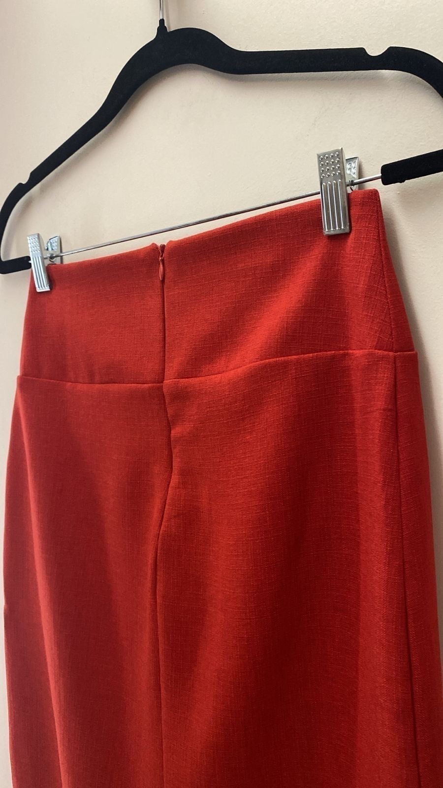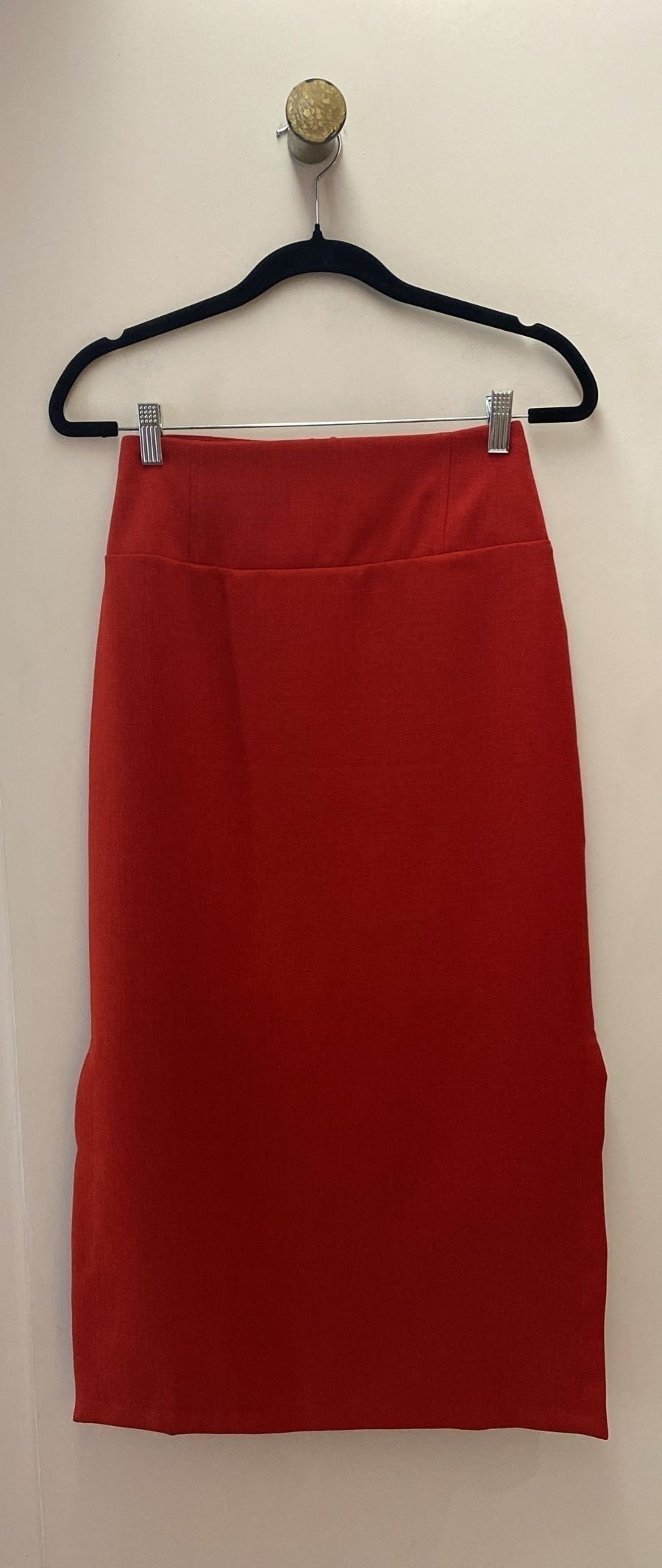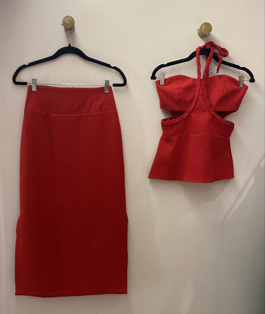 Conjunto em linen rustic vermelho, com blusa com detalhe trançado, recorte laterais e fechamento com zíper nas costas. Saia reta e fenda nas duas laterais. Fechamento com zíper nas costas.