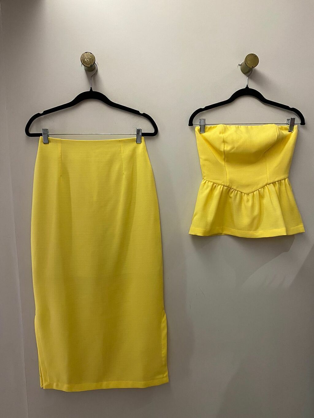 Conjunto em linen rustic amarelo com blusa tomara que caia peplum. Fechamento com zíper nas costas.