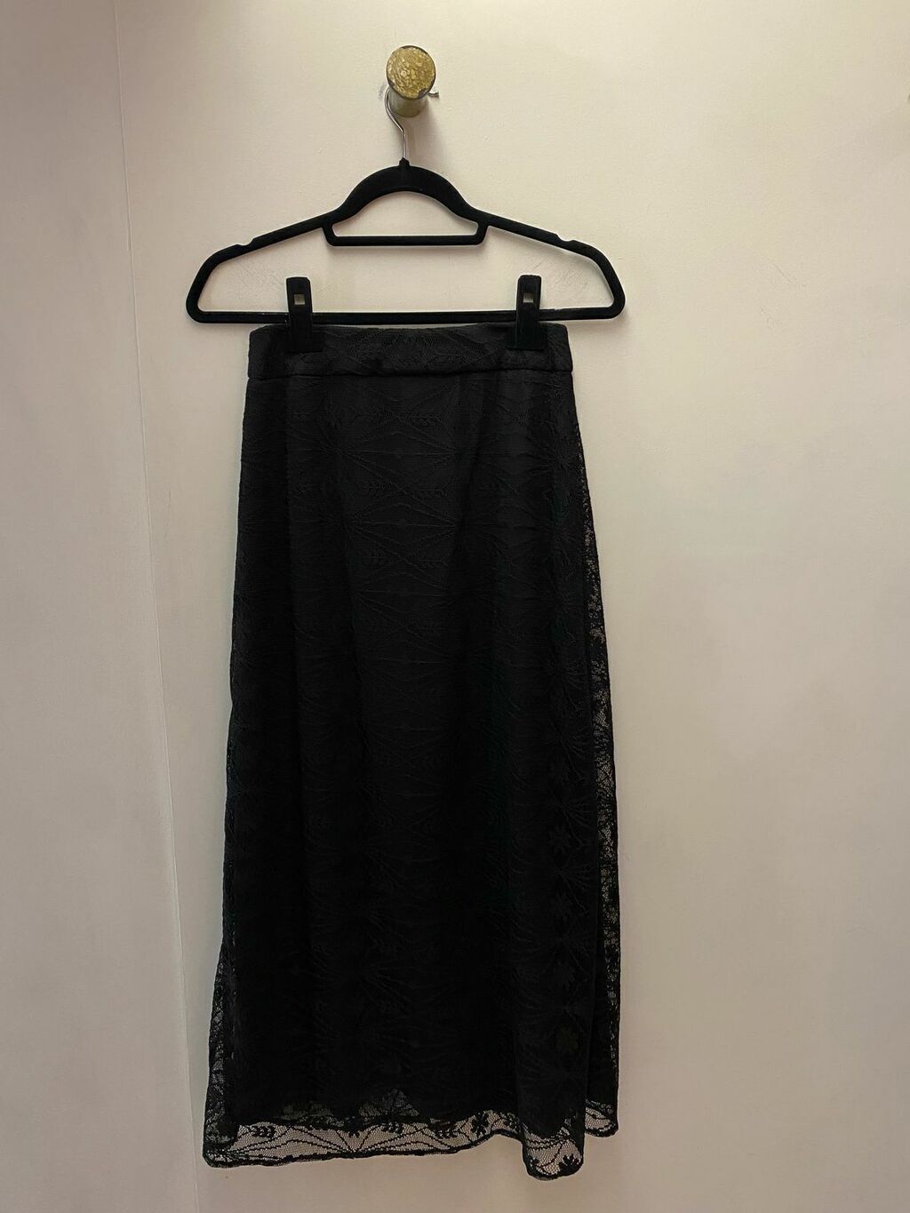 A Saia Brenda é uma peça sofisticada em renda preta evasê midi, perfeita para ocasiões especiais. O fechamento com zíper nas costas garante um ajuste impecável.