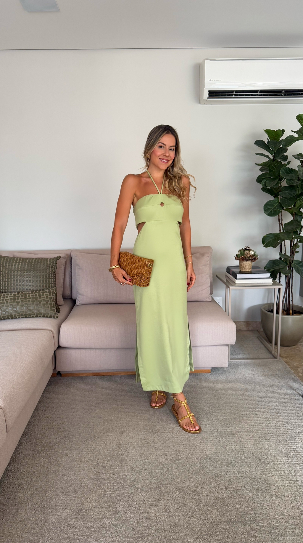 Vestido em viscolinho verde com amarração no pescoço, recorte do busto e vazado nas laterais.