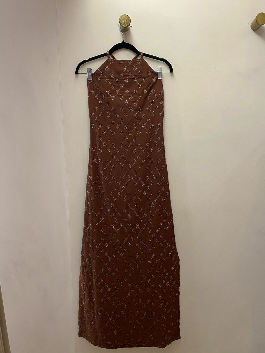 Vestido Betina em linho marrom com sofisticado bordado e fio de lurex sutil. Destaca-se pela cava americana e decote deslumbrante com amarração nas costas. A saia longa possui fendas laterais elegantes, complementadas por um fechamento com zíper.