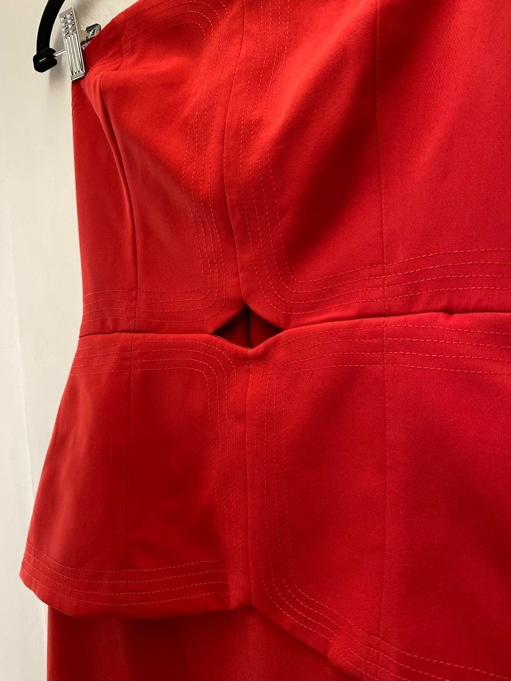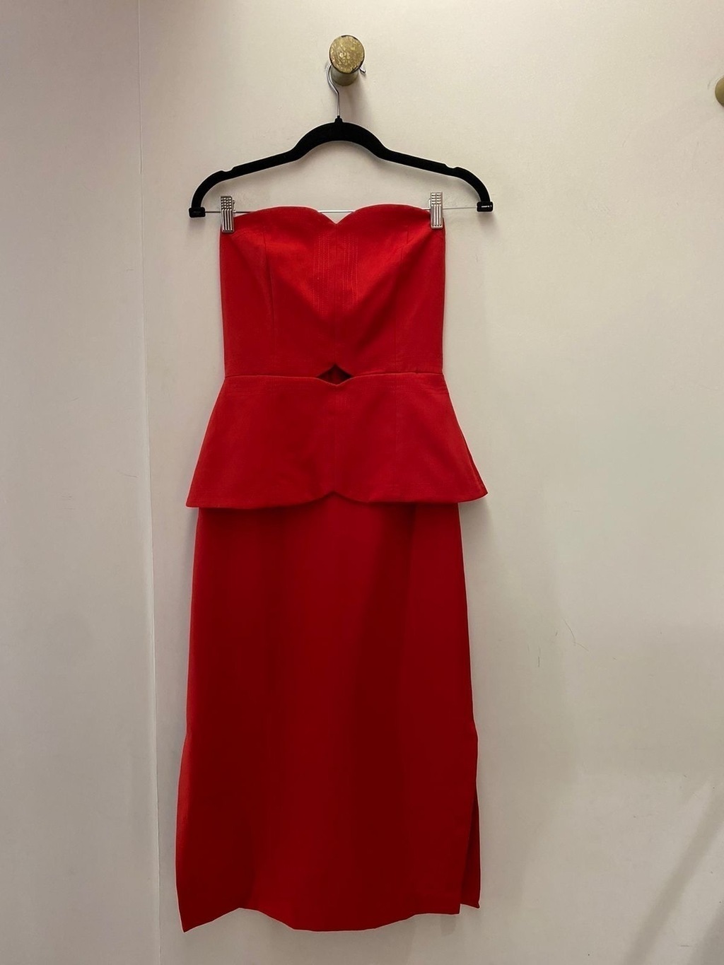 Vestido em crepe alfaiataria tomara que caia vermelho com detalhe pespontado, detalhe vazado , saia com fendas laterais.