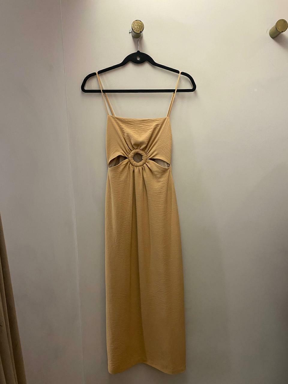 Vestido midi em crepe air flow bege com argola e recortes lateral.
