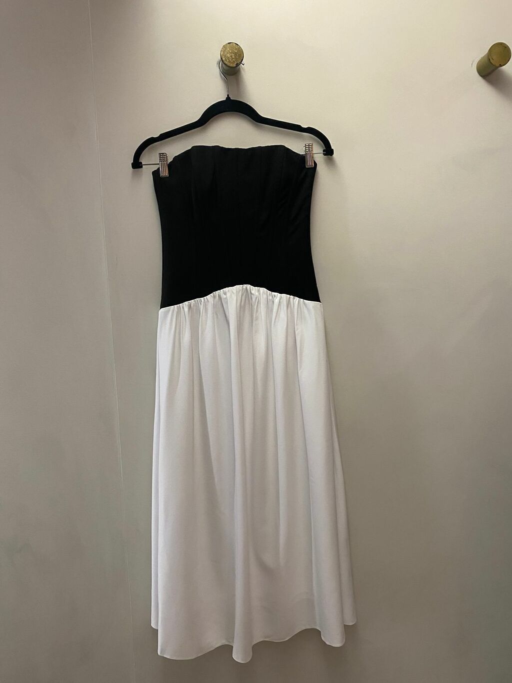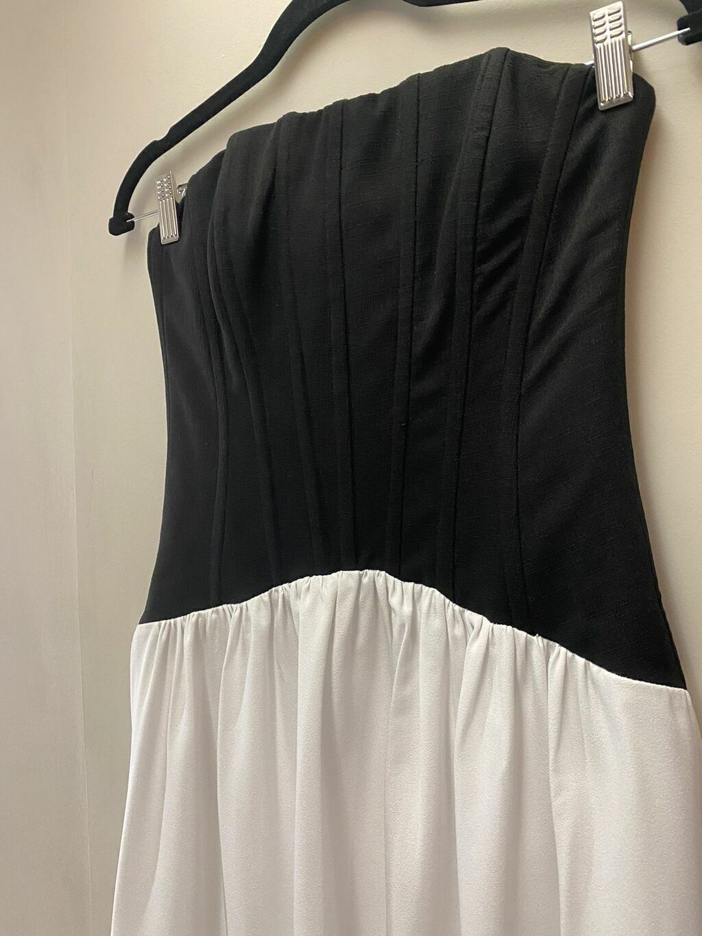 Vestido tomara que caia com barbatana em linen rustic preto com saia franzida em crepe off white.