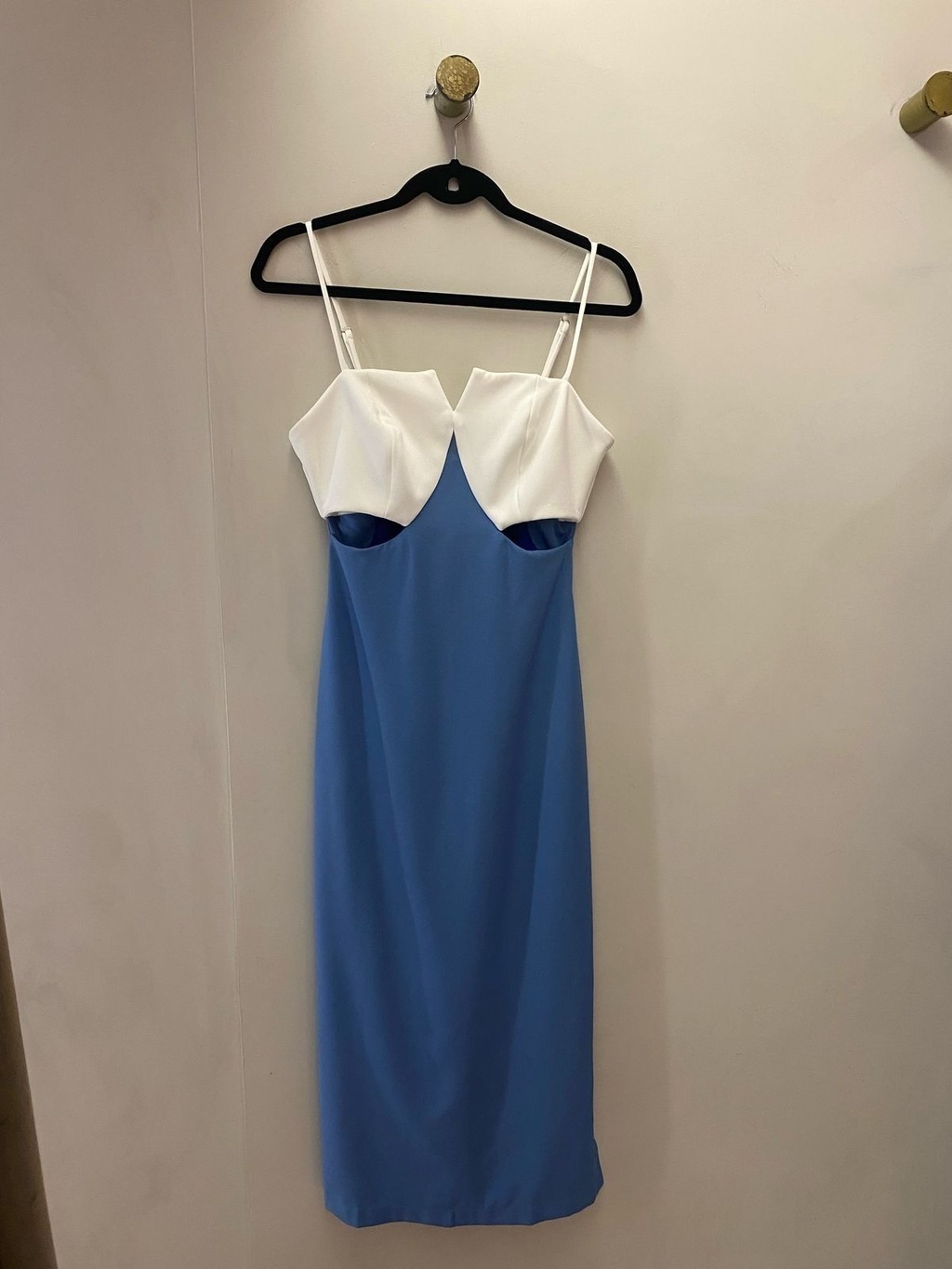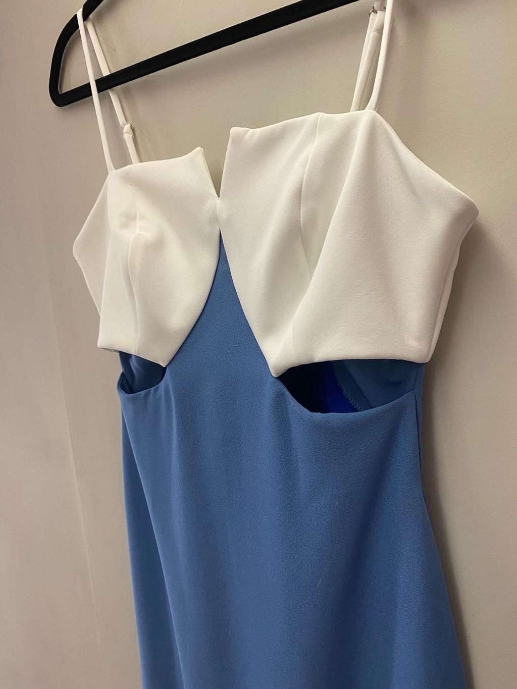 Vestido em crepe alfaiataria com busto em crepe branco e azul claro , fechamento com zíper nas costas e fenda nas duas laterais.