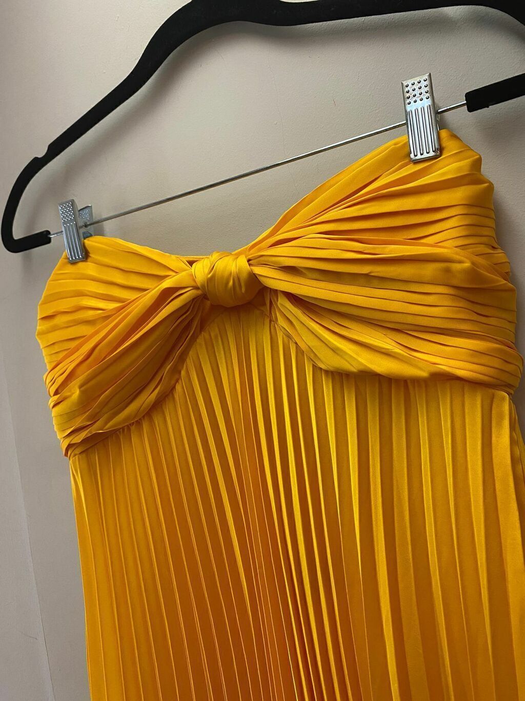 Vestido em cetim plissado tomara que caia amarelo com detalhe torcido no busto.