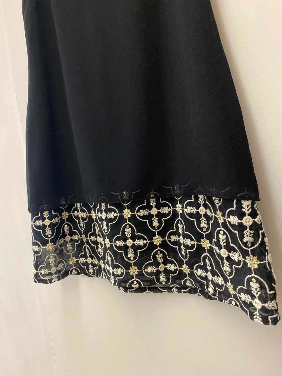Vestido Estela: elegância em cada detalhe! Confeccionado em musseline preto com barrado em musseline bordado, apresenta gola V que valoriza o colo.