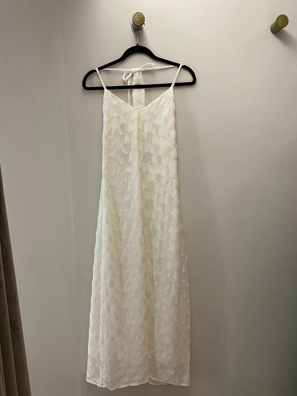 Vestido em chiffon branco com bordado em off white. Frente unica com amarração nas costas.