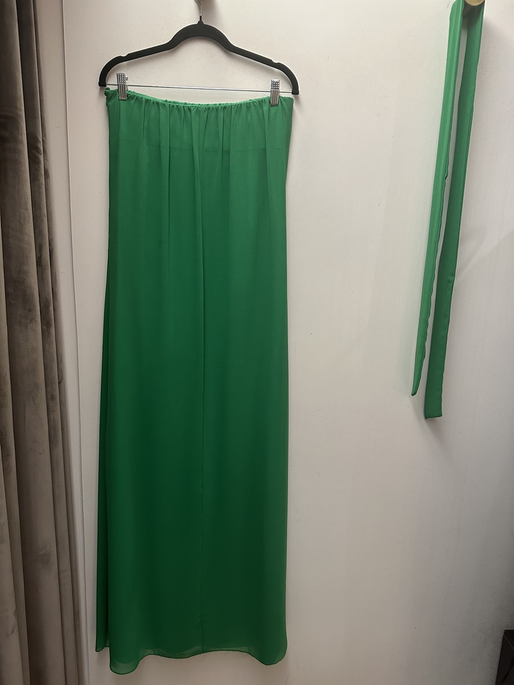 Vestido longo em musseline cor verde bandeira, tomara que caia.