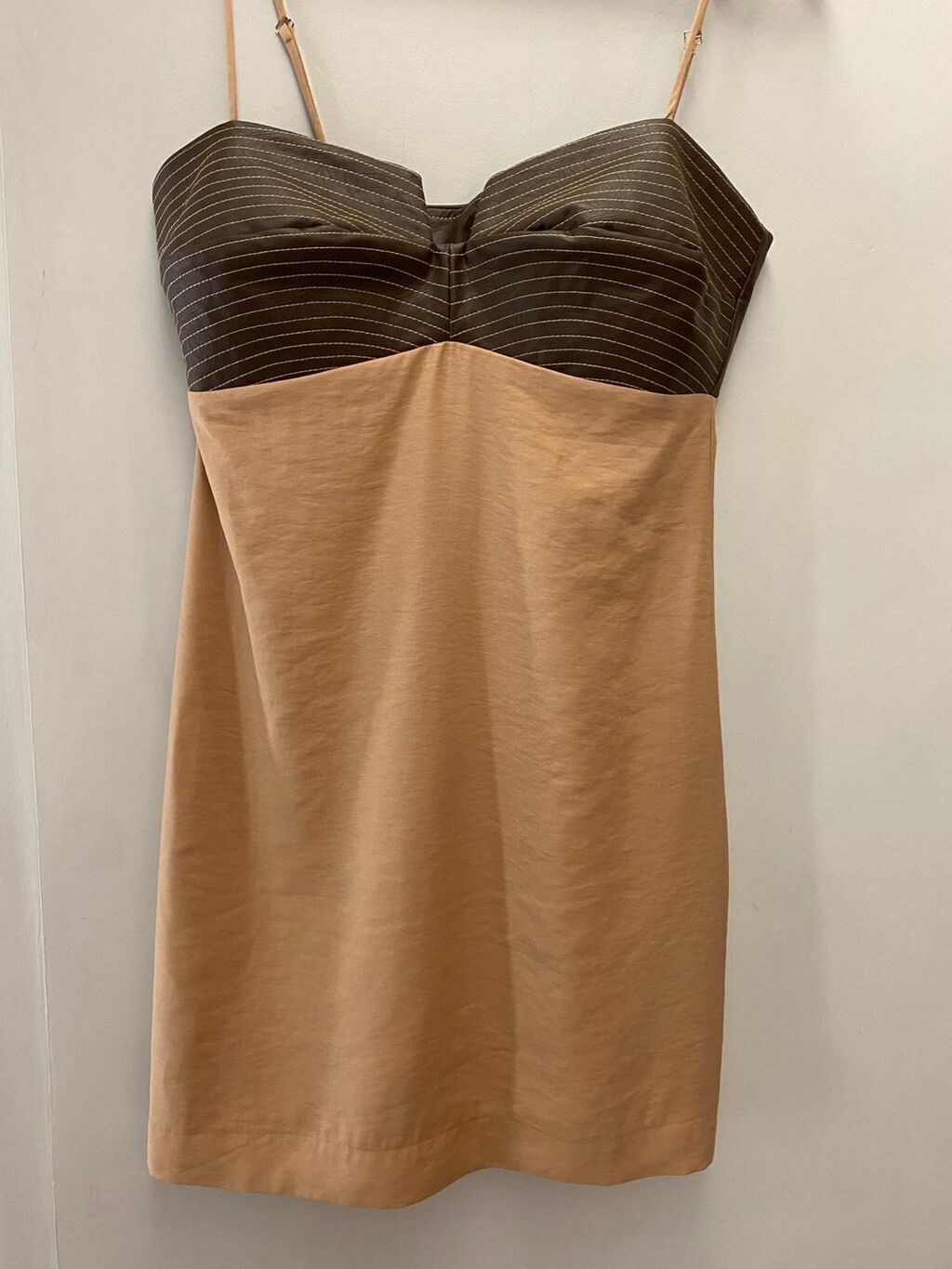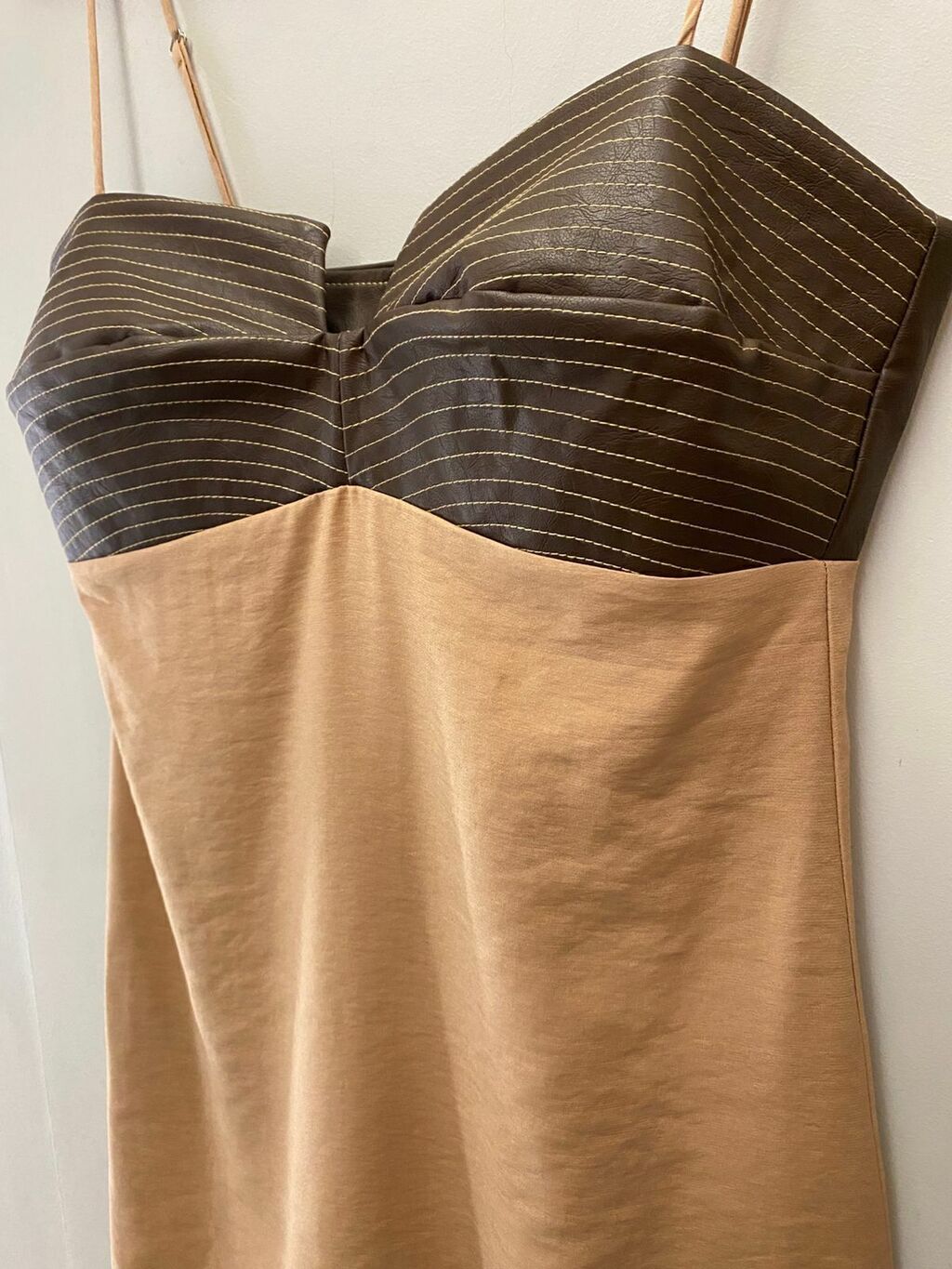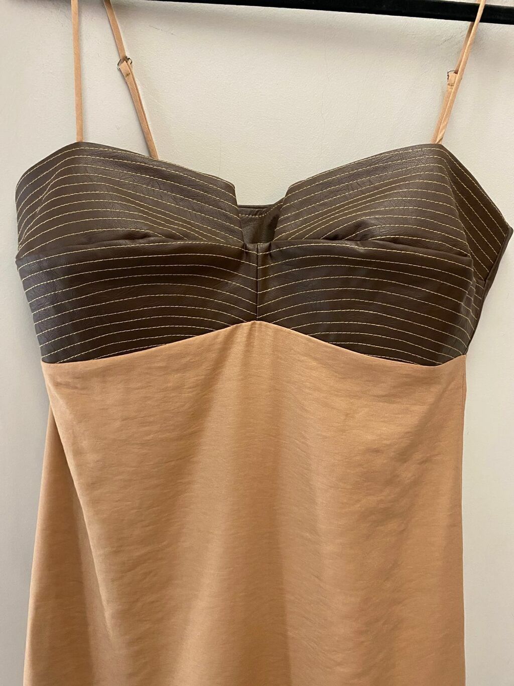 Vestido Jamile midi: Sofisticação e atitude em cada detalhe! Em crepe alfaiataria bege, traz busto em couro marrom pespontado que valoriza o colo, e saia curta, no tamanho ideal.