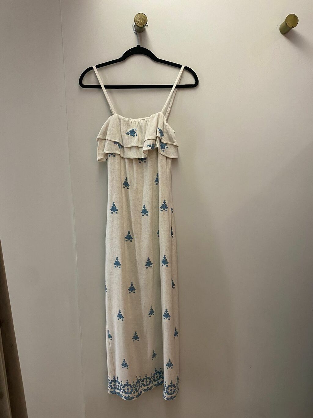 Vestido em linho bordado gelo com azul . Babados no busto e saia reta com fenda nas costas.