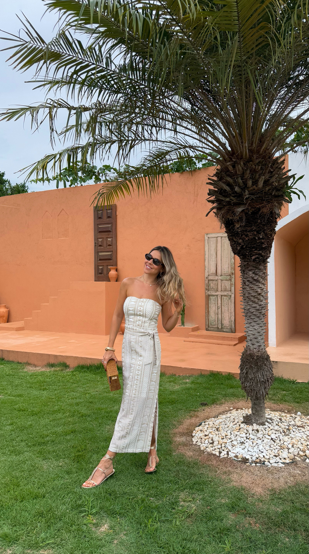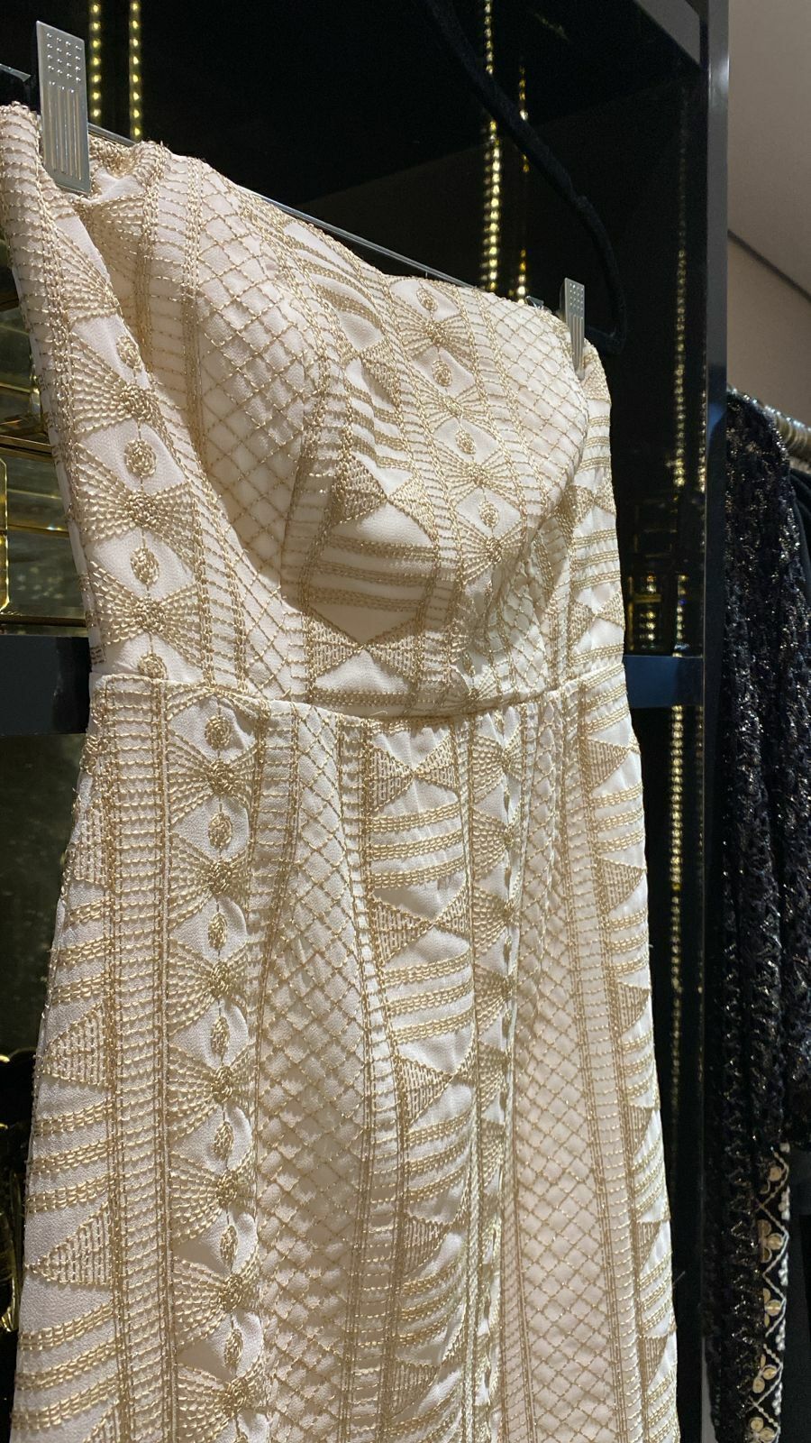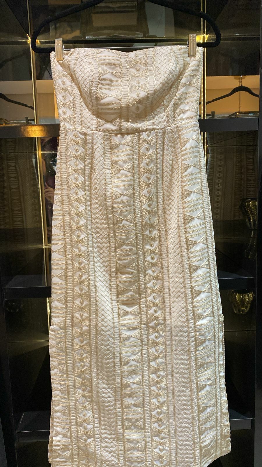 Vestido tomara que caia em crepe off com bordado em dourado.