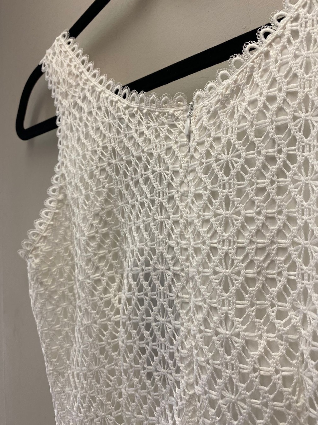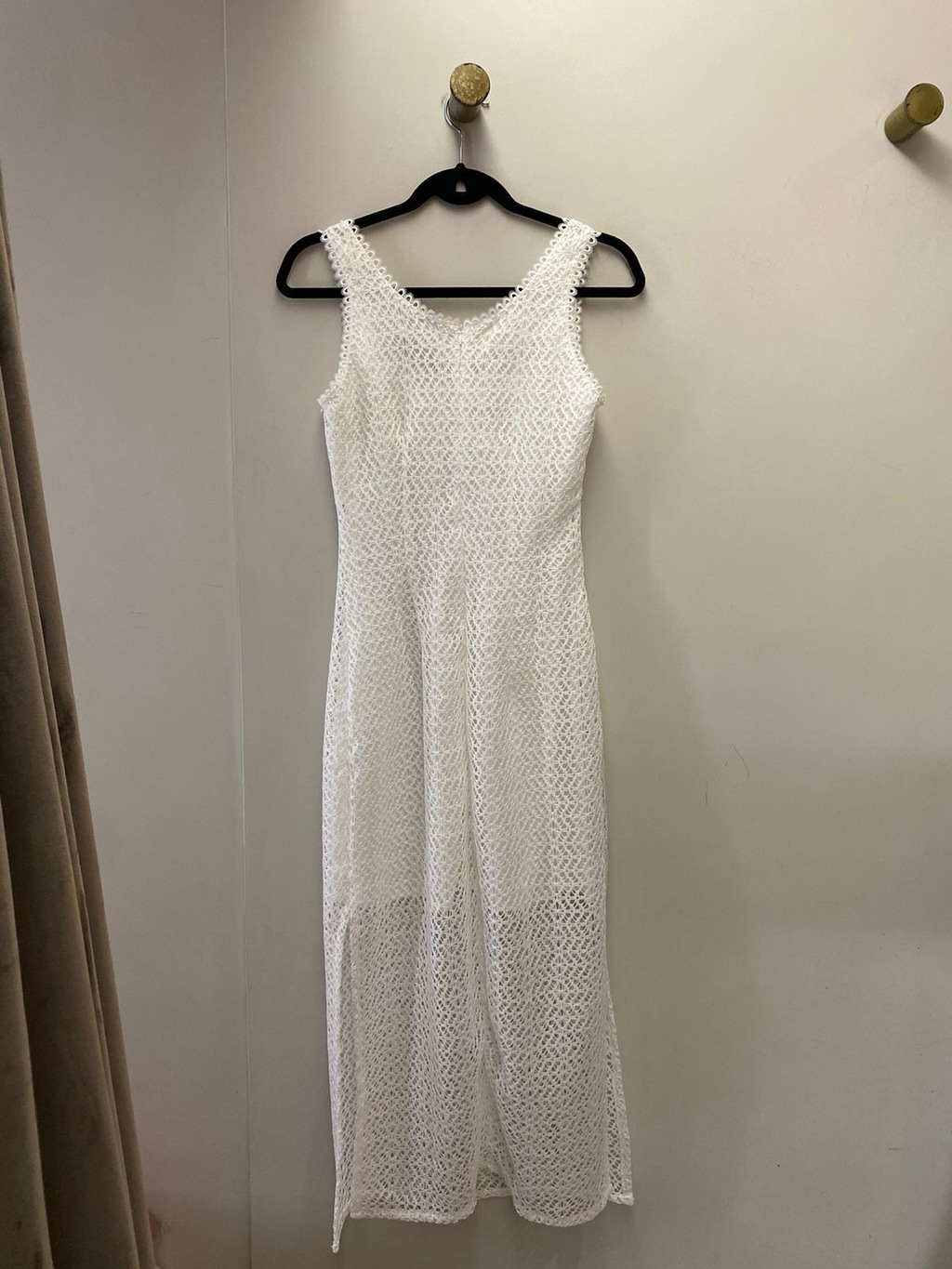 Vestido em tela rendada branco com decote quadrado, saia midi com fendas laterais.