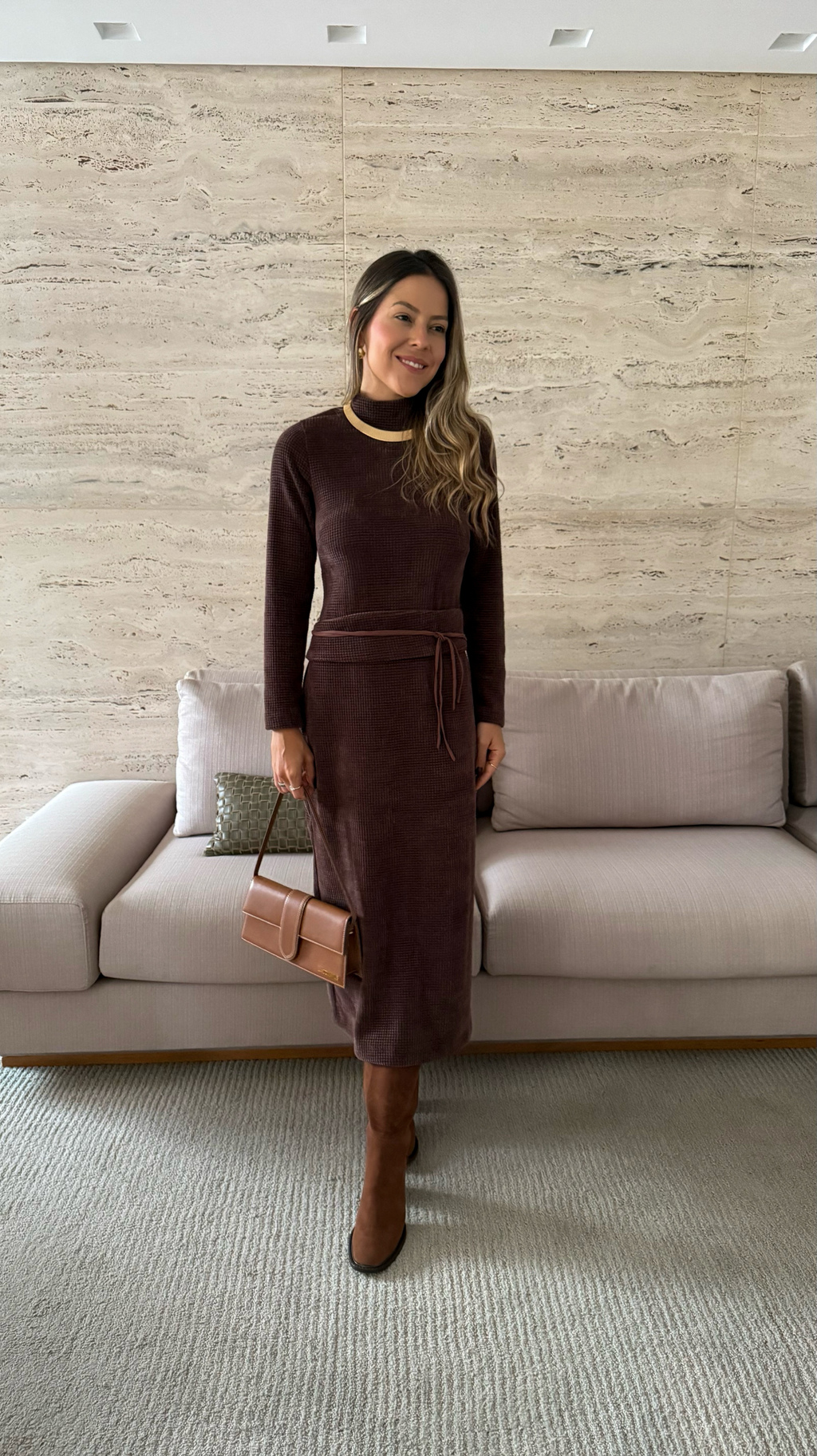 Vestido Midi Catarina em veludo marrom, destaca-se pela sua elegância atemporal. Com gola alta e saia reta, possui fenda nas costas. Ideal para o inverno, o tecido proporciona um toque super agradável e muito conforto.