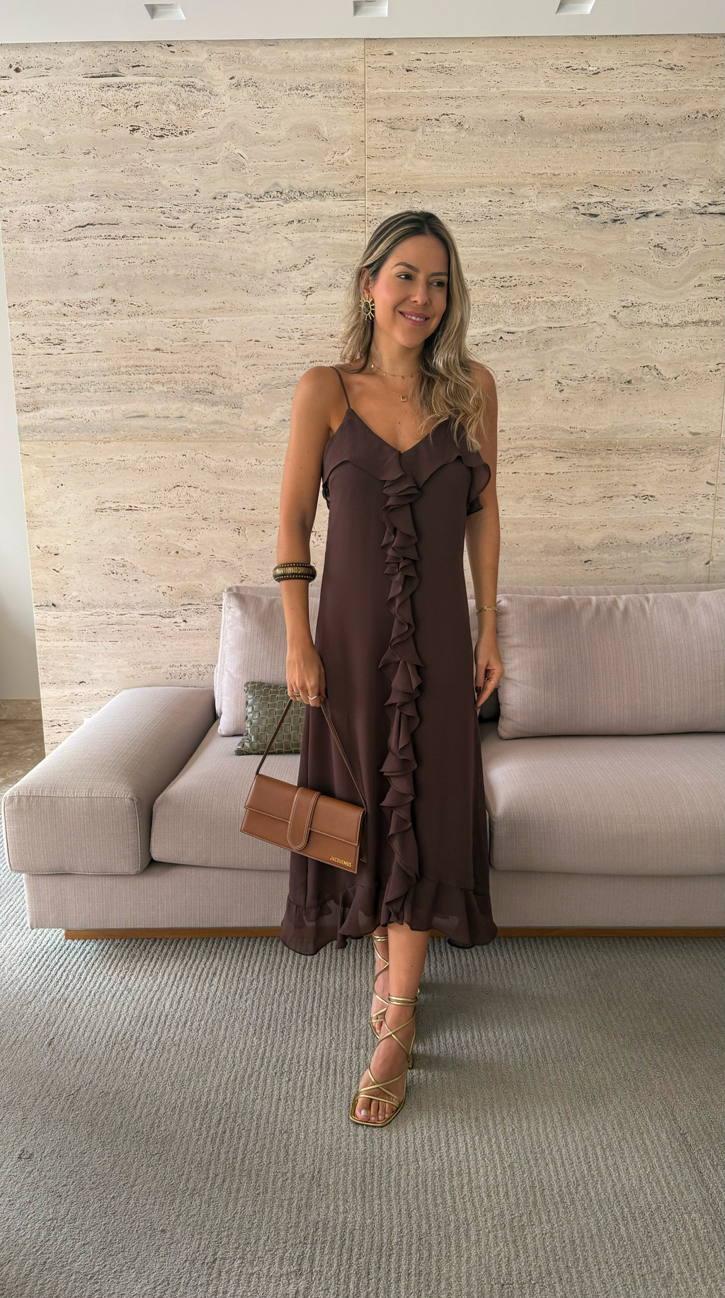 Vestido Monica: Um toque de elegância com musseline marrom, babados no decote e frontal, além de uma saia com leve mulet. Super leve e estiloso, é a escolha perfeita para ocasiões especiais.