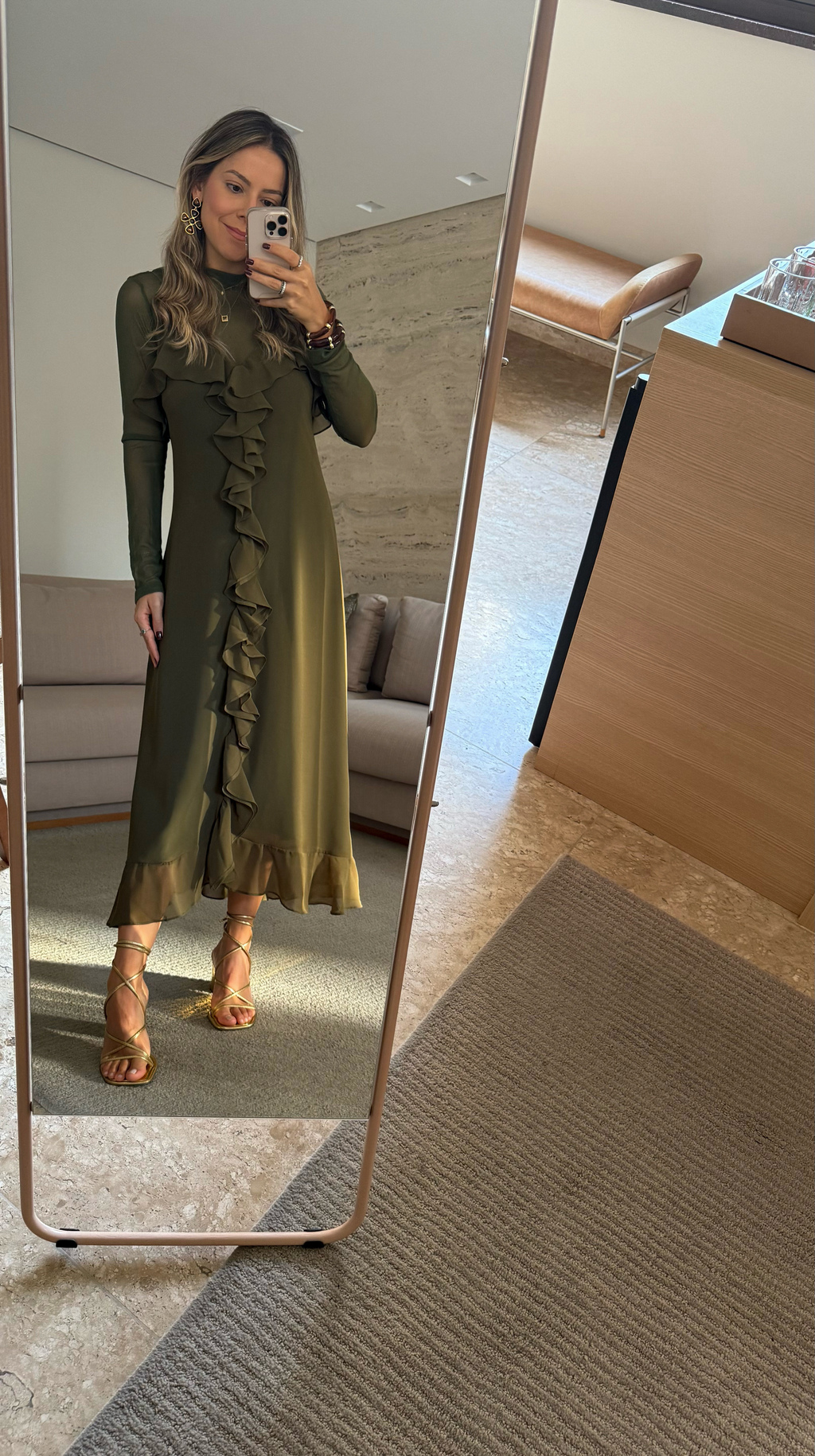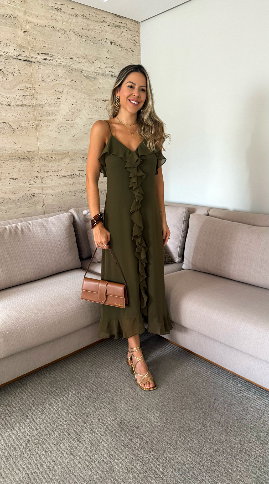 Vestido Monica: Um toque de elegância com musseline verde, babados no decote e frontal, além de uma saia com leve mulet. Super leve e estiloso, é a escolha perfeita para ocasiões especiais.