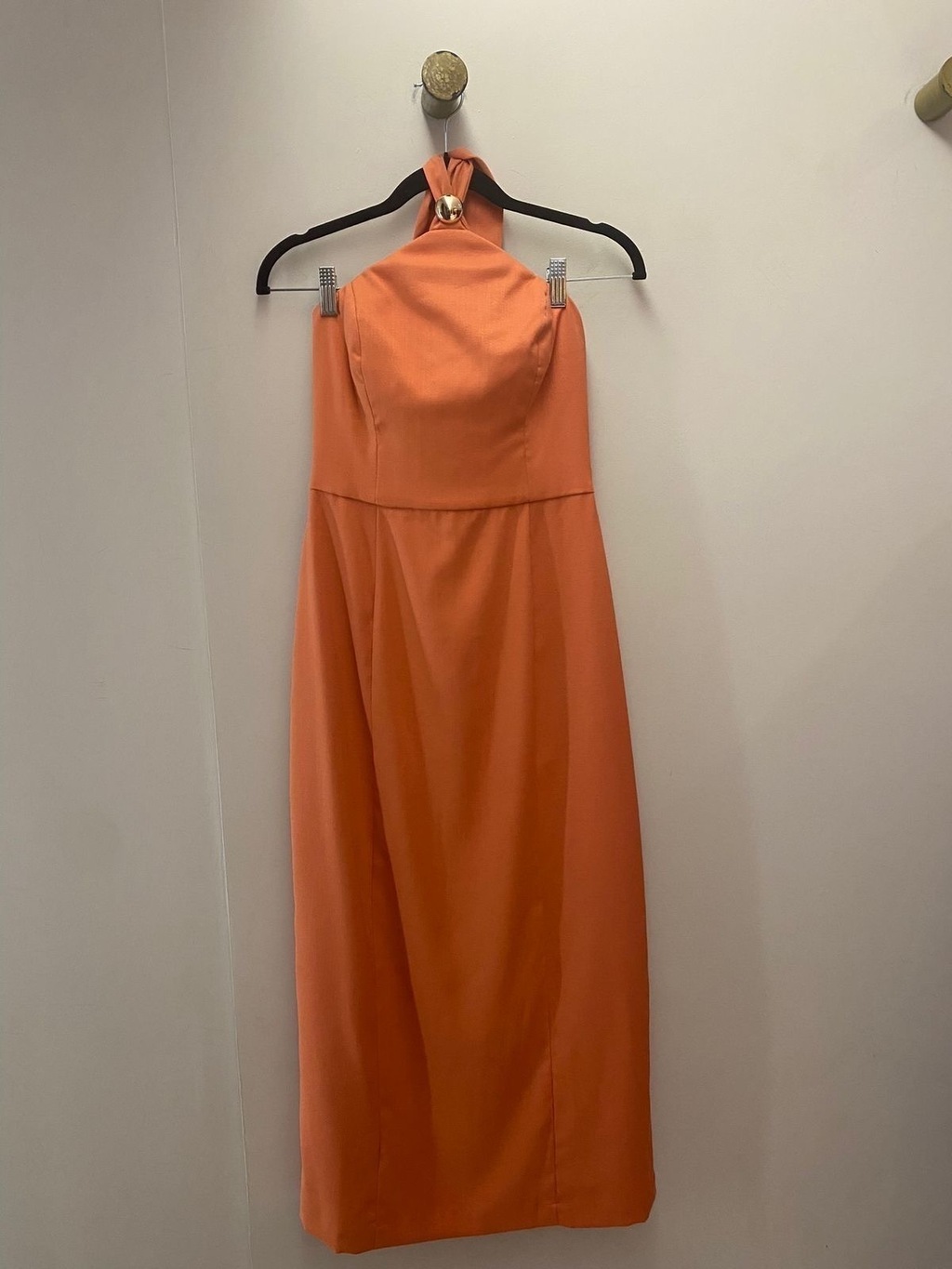 Vestido em viscolinho salmão frente única com detalhe em metal dourado, amarração no pescoço.