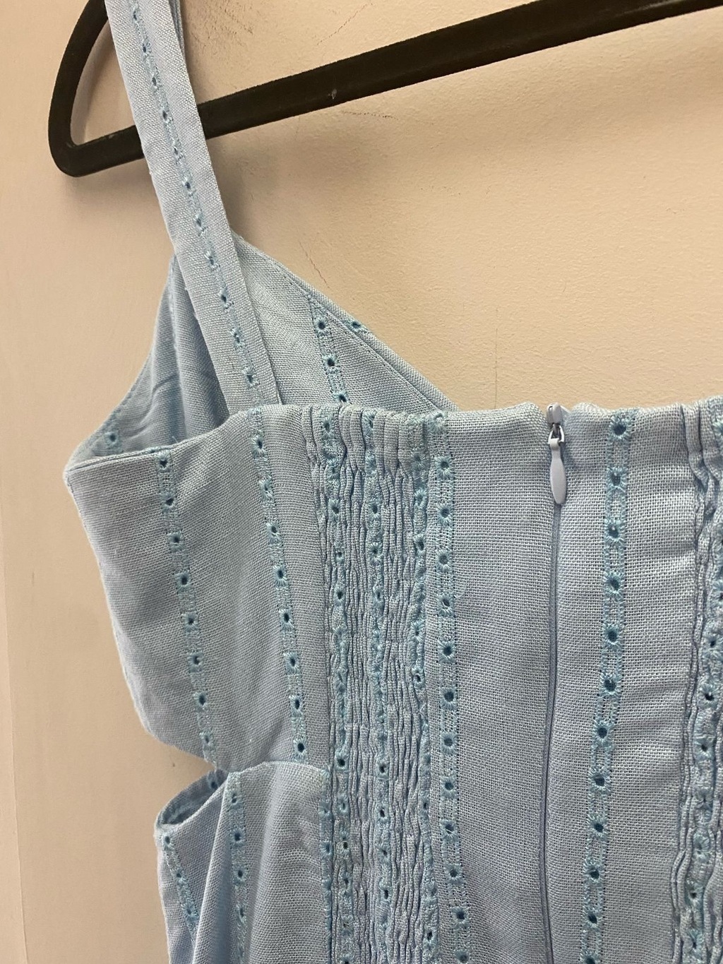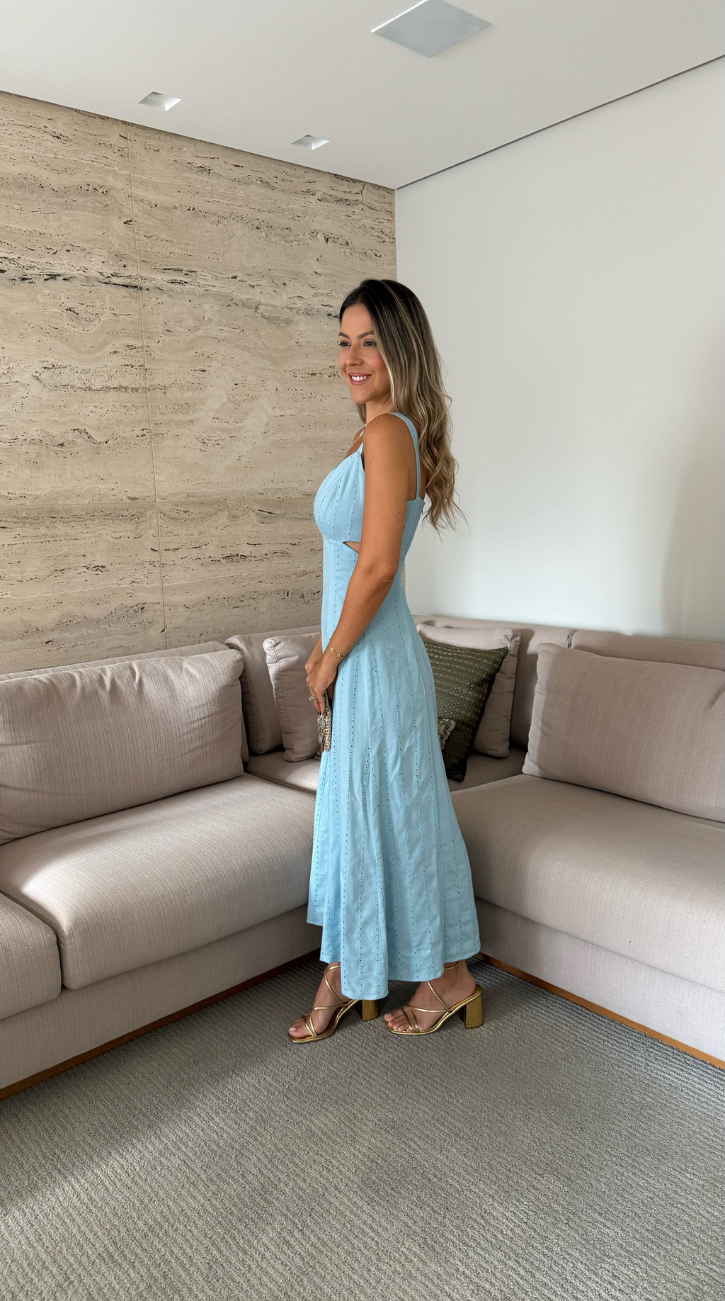 Vestido Patricia: um encanto em linho bordado azul claro, projetado para destacar a delicadeza. Com um pequeno recorte lateral, oferece um toque sutil de charme. O fechamento com zíper e lastex nas costas garante um caimento impecável.