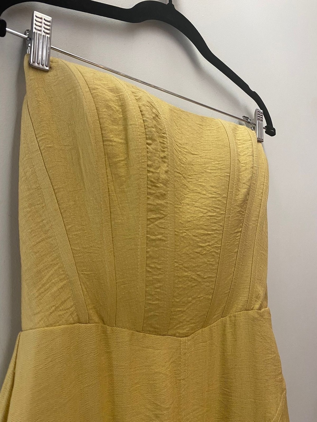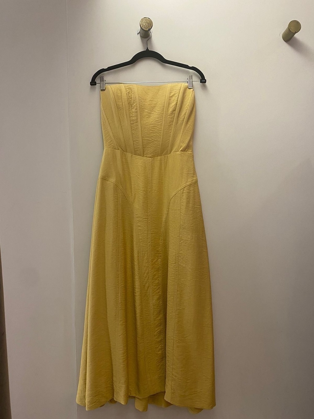 Vestido tomara que caia em crepe amarelo com barbatana e saia godê com recortes e bolsos laterais.