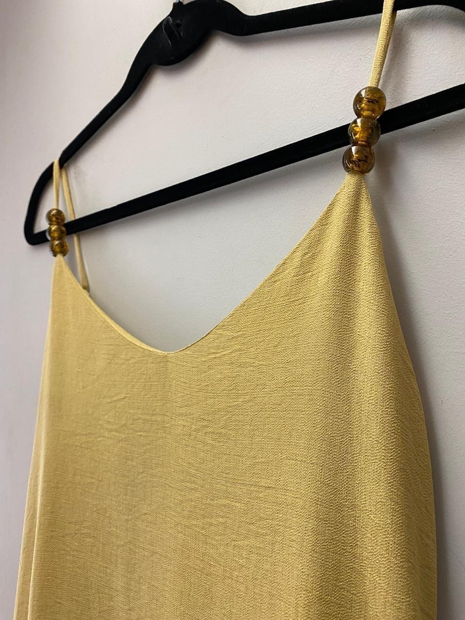 Vestido longo em crepe amarelo com detalhe de bolas em resina na alça , saia com babado na barra.