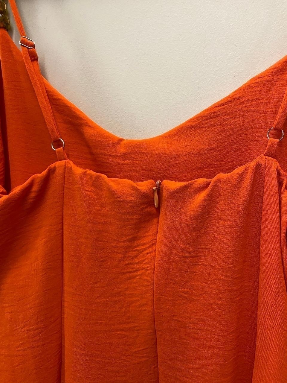 Vestido longo em crepe coral com detalhe de bolas em resina na alça , saia com babado na barra.