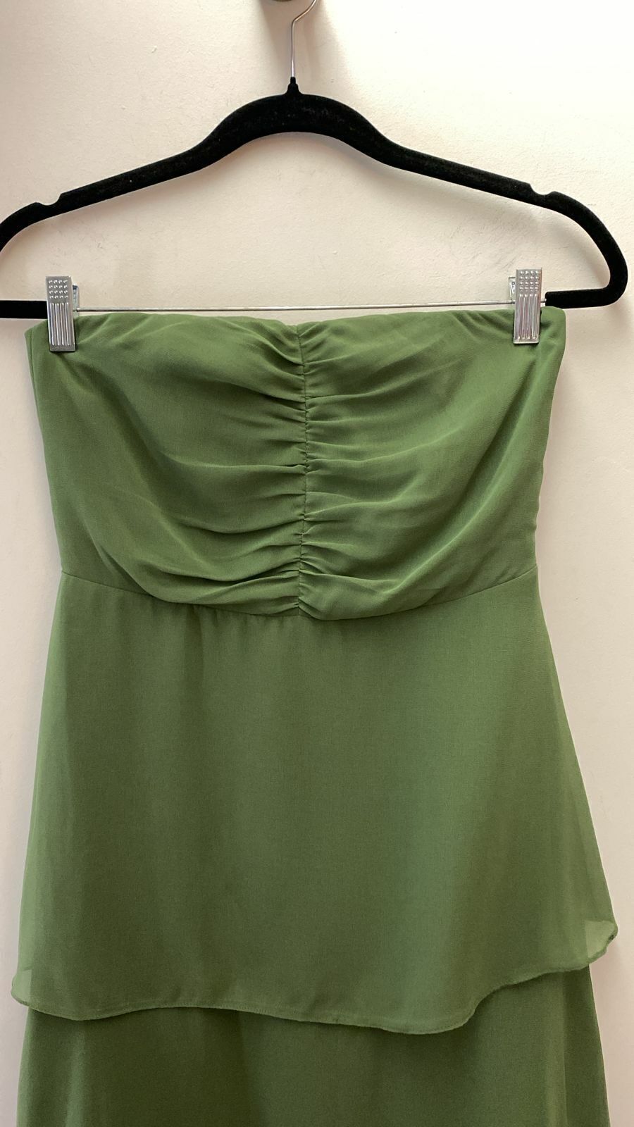 Vestido longo em musseline verde oliva, tomara que caia , saia com babados.